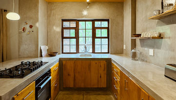 The kitchen at Ons Blyplek is fully equipped with a fridge/freezer, oven, stove, microwave, toaster, and kettle — perfect for preparing meals in the bush.